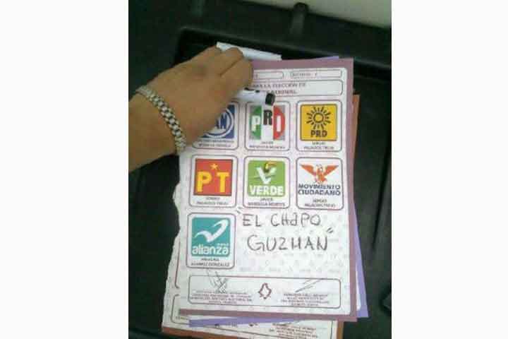 NOTICIAS 01/07/2012Difunden boleta de ciudadano que votó por ¡El Chapo Guzmán!En una imagen difundida en Facebook, se aprecia el voto de un ciudadano que sufragó a favor del líder del Cártel de Sinaloa, "El Chapo" Guzmán.