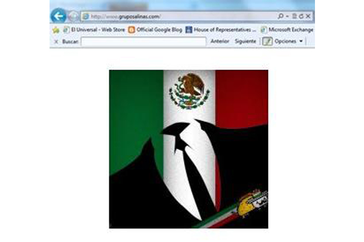 NOTICIAS 02/05/2012Se restablece servicio en página "Grupo Salinas" tras el hackeo de Anonymous La página web de Grupo Salinas fue restablecida luego de que fue hackeada la noche del primero de Mayo por el grupo Anonymous.