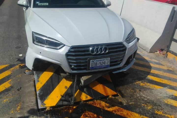 Un lujoso automóvil Audi sufrió diversos daños materiales al estrellarse contra la barrera del sistema "antieludidos" de la caseta de cobro de Taretan, sin que se tenga reporte de personas heridas.