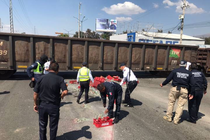 NOTICIAS 18/02/2023Tráiler refresquero intenta ganarle el paso al tren y ocasiona accidenteUn tráiler de la empresa Coca Cola, intentó ganarle el paso al ferrocarril, no lo logró y fue alcanzado por la pesada máquina, siendo golpeado al final de su segundo remolque, lo que género que decenas de cajas con envases para refresco terminaran sobre el pavimento.