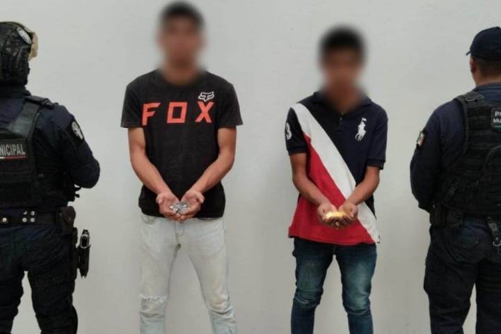 Policías municipales de Zamora detuvieron a dos muchachos en posesión de varios envoltorios con sustancia granulada con las características propias de la metanfetamina.