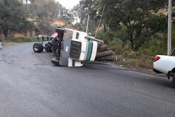 Un camión cargado con troncos se volcó en el municipio de Zitácuaro situación que generó la movilización del Heroico Cuerpo de Bomberos.