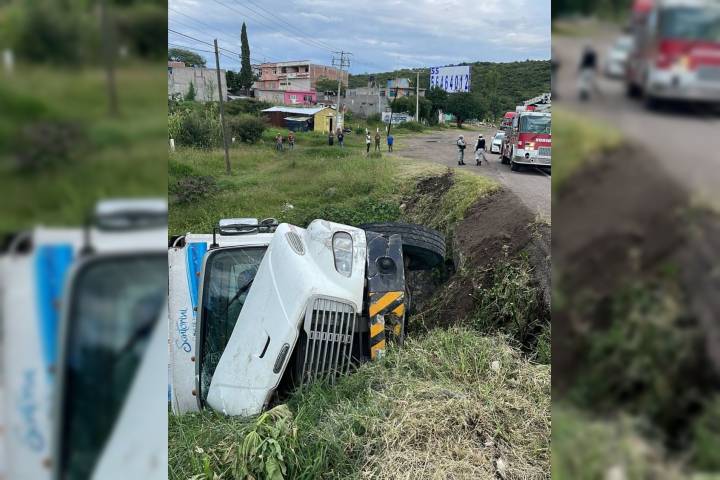 Un camión repartidor de agua Santorini terminó volcado tras caer a un desnivel ubicado a la orilla de la carretera Morelia-Salamanca, trascendió en la labor noticiosa.