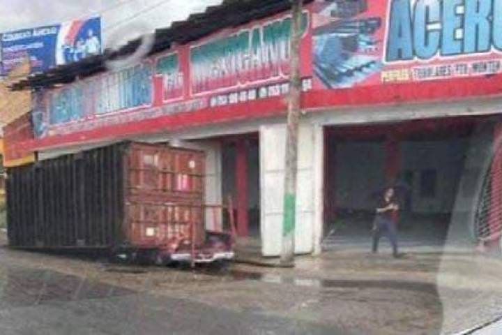 Un contenedor de carga se desprendió de tracto camión y cayó sobre camioneta a la que dejó totalmente destrozada en el entronque Las Adelitas en la entrada de la ciudad de Lázaro Cárdenas.