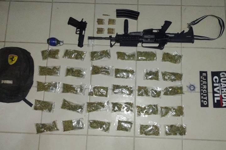 NOTICIAS 30/08/2022Tras persecución, Guardia Civil asegura 30 envoltorios de droga, dos armas de fuego y un artefacto explosivo Como resultado a la rápida acción operativa de la Secretaría de Seguridad Pública (SSP), elementos de la Guardia Civil aseguraron a una persona del sexo masculino en posesión de 30 envoltorios de hierba verde y seca con las características propias de la marihuana, dos armas de fuego, 21 cartuchos útiles y una granada de fragmentación, así como sustancia granulosa aparentemente metanfetamina.