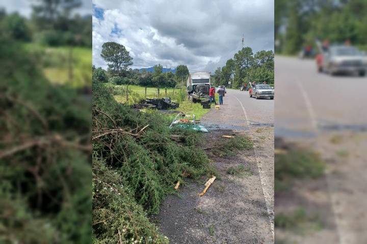 Un camión tipo Torton, que era conducido en evidente exceso de velocidad, se impactó contra un árbol y un señalamiento metálico, para terminar volcándose, en la entrada a esta comunidad de Zacán y el libramiento.