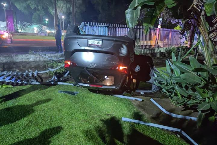 Convertido en chatarra, quedó un automóvil, en el que viajaban cuatro jóvenes, que resultaron lesionados, luego de que esta madrugada, se impactaron y derribaron el barandal, junto al acceso principal de la Facultad de Agrobiología; la unidad quedó volcada, dentro de la institución.