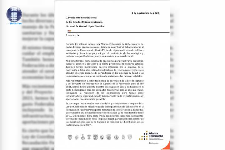 NOTICIAS 02/11/2020Envía Alianza Federalista carta al Presidente de México El gobernador de Michoacán, Silvano Aureoles Conejo en conjunto con los 9 mandatarios más que integran la Alianza Federalista, hicieron llegar al presidente de México, Andrés Manuel López Obrador, una carta en la que proponen posponer el debate sobre el Sistema de Coordinación Fiscal y concentrarse en el presupuesto 2021, en la que emiten postura de que ningún estado del país reciba menos recursos en términos reales que en el año 2020.... Ver más...