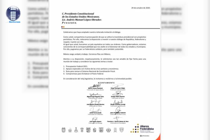 NOTICIAS 29/10/2020Celebramos aceptación al diálogo, alianza federalista a AMLO C. Presidente Constitucional