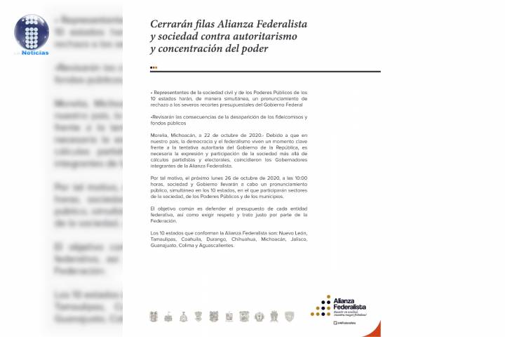 NOTICIAS 22/10/2020Cerrarán filas Alianza Federalista y sociedad contra autoritarismo y concentración del poderDebido a que en nuestro país, la democracia y el federalismo viven un momento clave frente a la tentativa autoritaria del Gobierno de la República, es necesaria la expresión y participación de la sociedad más allá de cálculos partidistas y electorales, coincidieron los Gobernadores integrantes de la Alianza Federalista.