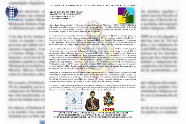 El marco de la visita del Presidente Andrés Manuel López Obrador a Michoacán, el Consejo Supremo Indígena de Michoacán (CSIM), consejo autónomo conformado por autoridades indígenas de 60 comunidades, denunciaron públicamente que el Gobierno Federal, así como el Gobierno de Michoacán, mienten, excluyen y discriminan a las comunidades originarias.