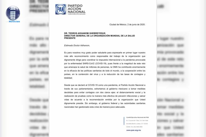 NOTICIAS 04/06/2020Solicita PAN a la OMS reconsiderar postulación de López Gatell En una misiva dirigida al Dr. Tedros Adhanom Ghebreyesus, Director General de la Organización Mundial de la Salud (OMS), el Partido Acción Nacional solicitó reconsiderar la postulación del Subsecretario de Prevención y Promoción de la Salud del gobierno federal, como parte del grupo de expertos que formularán el Reglamento Sanitario Internacional, debido a que sus decisiones han ignorado las recomendaciones de la propia OMS.