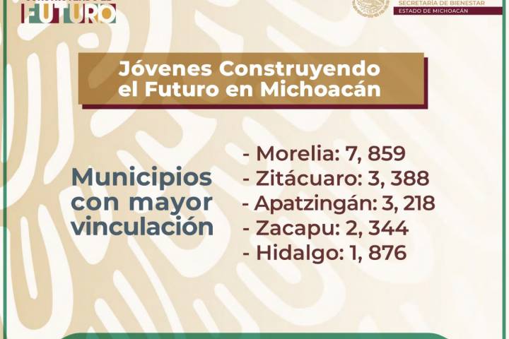 NOTICIAS 10/01/2020Supera Michoacán su meta para Jóvenes Construyendo el Futuro El programa Jóvenes Construyendo el Futuro (JCF) superó la meta planteada para el estado de Michoacán en 2019, con más de 50 mil jóvenes vinculados en alrededor de 15 mil centros de trabajo.