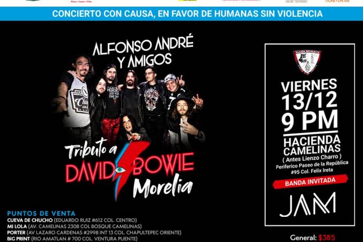 NOTICIAS 03/12/2019Integrantes de Caifanes rendirán Tributo a David Bowie, en Morelia Alfonso André, músico y baterista de Caifanes, así como Rodrigo Baills, integrante de esta icónica banda de rock mexicano, rendirán un Tributo a David Bowie el próximo viernes 13 de diciembre en la Hacienda Camelinas (Antes Lienzo Charro) de Morelia, a partir de las 9:00 PM.