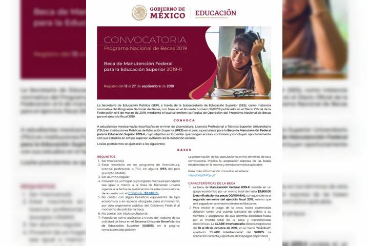 NOTICIAS 17/09/2019 Federación emite convocatoria en Michoacán para Becas de Manutención para la Educación SuperiorLa Secretaría de Bienestar, Delegación Michoacán, convoca a estudiantes inscritos en el nivel superior en instituciones públicas, a postularse para la Beca de Manutención Federal para la Educación Superior 2019-II, cuyo objetivo es coadyuvar a que continúen y concluyan sus estudios, para evitar así la deserción escolar.