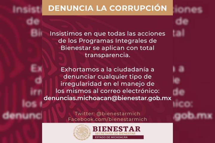 NOTICIAS 02/07/2019Llama Bienestar a denunciar actos de corrupción en programas federalesLa Secretaría de Bienestar en Michoacán llama a la ciudadanía a reportar cualquier mal uso de los programas federales que implementa el Gobierno de México, en beneficio de los sectores más vulnerables.
