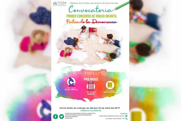 NOTICIAS 15/04/2019Convoca TEEM a participar en el Primer Concurso de Dibujo InfantilEl Pleno del Tribunal Electoral del Estado de Michoacán convoca a los niños y niñas de 6 a 12 años de edad a participar en el Primer Concurso de Dibujo Infantil.
