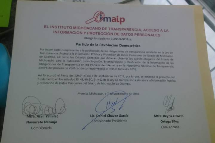 NOTICIAS 07/09/2018PRD cumple a cabalidad con Transparencia Al haber dado cumplimiento a 100 por ciento con las obligaciones señaladas en la Ley de Transparencia, Acceso a la Información Pública y Protección a Datos Personales del Estado de Michoacán, el Partido de la Revolución Democrática (PRD) fue reconocido por el Instituto Michoacano de Transparencia, Acceso a la Información y Datos Personales (IMAIP).