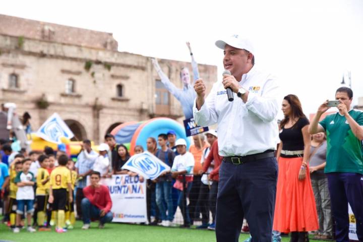 NOTICIAS 23/06/2018Carlos Quintana brindará mejores oportunidades a jóvenes y niños a través del deporteCon el deporte y el sano esparcimiento, es como se sacará adelante a los jóvenes y niños de Morelia, además de que se alejarán de la delincuencia, por ello existe el compromiso de brindar las oportunidades para que logren destacarse, señaló Carlos Quintana Martínez, candidato presidente municipal de la coalición "Por Morelia al Frente", desde la plaza Valladolid, ante equipos de fútbol de diferentes colonias del municipio.