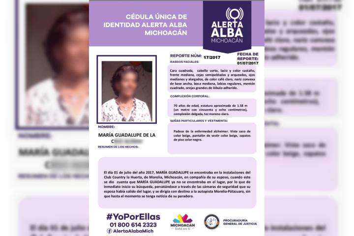 Trascendió que el sábado pasado los seres queridos de la señora la reportaron ante las autoridades competentes como desaparecida, instante en que se emitió la Alerta Alba para apoyo en su búsqueda.