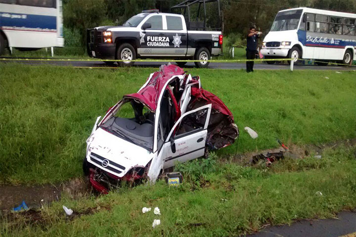 Un taxi quedó completamente deshecho al volcar y estrellarse contra dos árboles en la Autopista Siglo XXI, a la altura de esta municipalidad, instante en que dos de sus ocupantes perdieron la vida, uno de ellos quedó desmembrado. También hubo un sobreviviente.