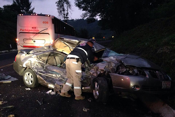 El accidente fue la mañana de este lunes en la carretera libre Uruapan - Pátzcuaro, a la altura del Conalep El Toreo, en este municipio, donde chocó un vehículo Nissan, Sentra, color plata contra un ómnibus de la línea Purhépechas, con número económico 608.