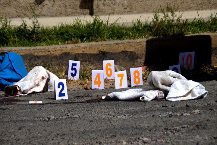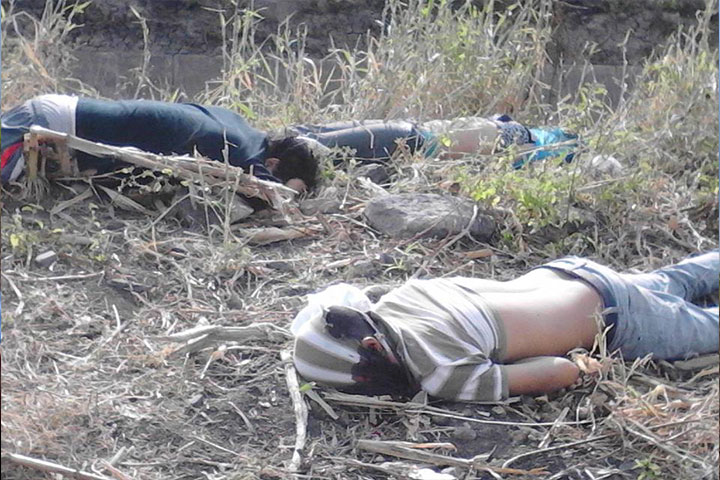 Cerca de una camioneta calcinada y junto a un canal de riego yacían tres cadáveres masculinos y uno femenino, a los cuatro se les apreciaba un balazo en la cabeza. Las autoridades policiales y militares acudieron al sitio de los hechos, el cual se ubica en el predio denominado Los Fresnos, perteneciente a este municipio.