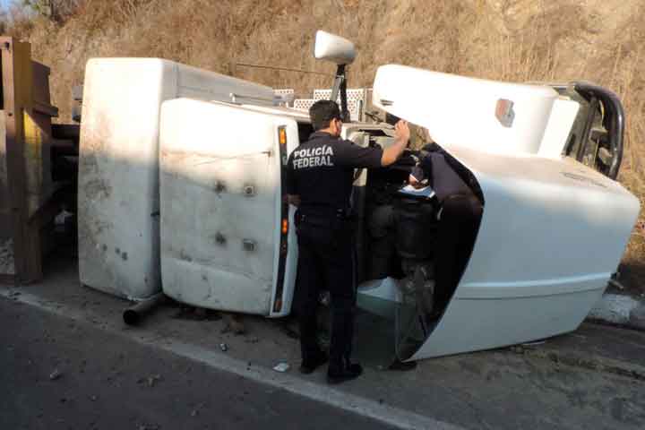 El conductor de un camión tipo góndola, cargado con varias toneladas de material mineral, se quedó dormido al volante y chocó contra un paredón, para posteriormente volcarse y quedar sobre su costado derecho; el chofer pereció dentro de la cabina de la unidad.