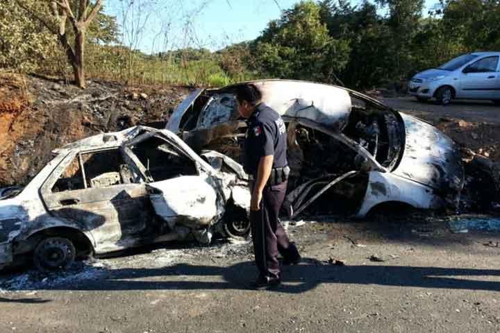 Cuatro personas murieron calcinadas dentro de dos automóviles, entre ellos un taxi de Apatzingán, que se impactaron por alcance y luego se incendiaron, en el tramo de la carretera Zihuatanejo-Lázaro Cárdenas. Otra persona fue rescatada y llevada a un hospital, donde permanece en estado de coma.