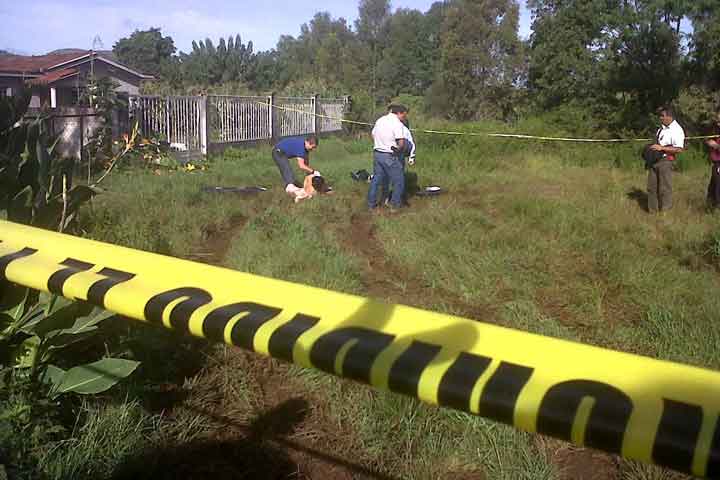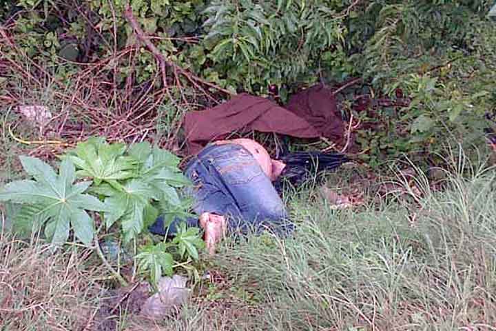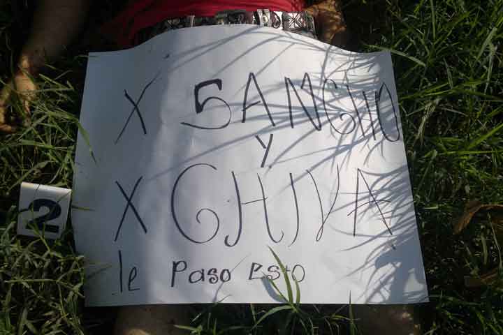 El cuerpo inerte de un hombre que tenía un balazo en la cabeza, fue encontrado por pobladores en una brecha que va de esta localidad a la ranchería de Las Caramicuas, en esta municipalidad. Sus victimarios le dejaron un letrero en el que se podía leer: "X sancho y x chiva le paso esto".