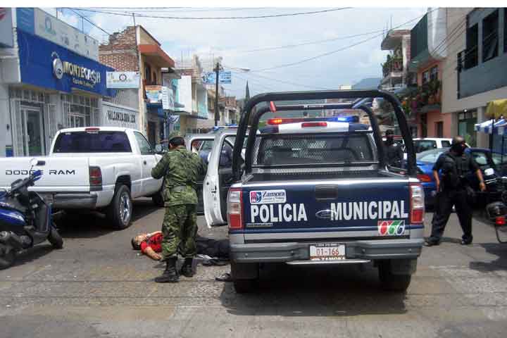 Un sujeto que ebrio y al parecer drogado fue reportado escandalizando en el mercado Hidalgo de Zamora fue detenido por la policía municipal pero, cuando los elementos pretendían subirlo a una patrulla, éste sacó una pistola y amagó a uno de los uniformados amenazando con matarlo de un tiro en la cabeza, por lo que sus compañeros vieron la acción y mataron al empistolado.