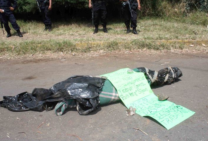 NOTICIAS 23/05/2012Los matan a golpes y les dejan recadoPoco antes del mediodía de este miércoles, fueron localizados los cadáveres de dos hombres, a quienes aparentemente mataron a golpes y asfixiaron, uno de ellos estaba encobijado y el otro cubierto de la cabeza con una bolsa de plástico; ambos estaban vendados de los ojos, atados de la manos, sin zapatos y con un mensaje de advertencia a los ladrones de casas, comercios y autos, el cual no estaba firmado por ningún grupo criminal.