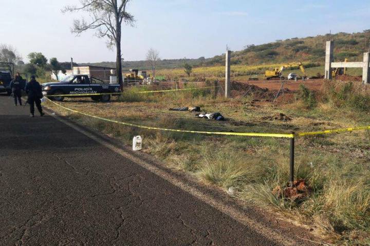 Dos cadáveres del sexo masculino con impactos de bala fueron localizados por la gente a una orilla de la carretera Ario de Rosales-La Huacana, a la altura de la población de Las Víboras en esta demarcación; con un arma blanca los victimarios grabaron en la espalda de los fallecidos unas siglas ilegibles.
