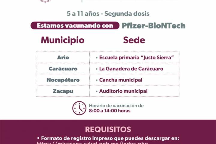 NOTICIAS 02/10/2022Del 3 al 7 de octubre se inmunizará a menores de 5 a 11 años de 40 municipios Se refuerza la estrategia Nacional de Vacunación anti COVID-19 en Michoacán, es así que durante la primera semana del mes de octubre, del 3 al 7, se inmunizará a menores de 5 a 11 años con primera y segunda dosis; así como niños y niñas con alguna comorbilidad en este rango de edad en 40 municipios y 5 comunidades.