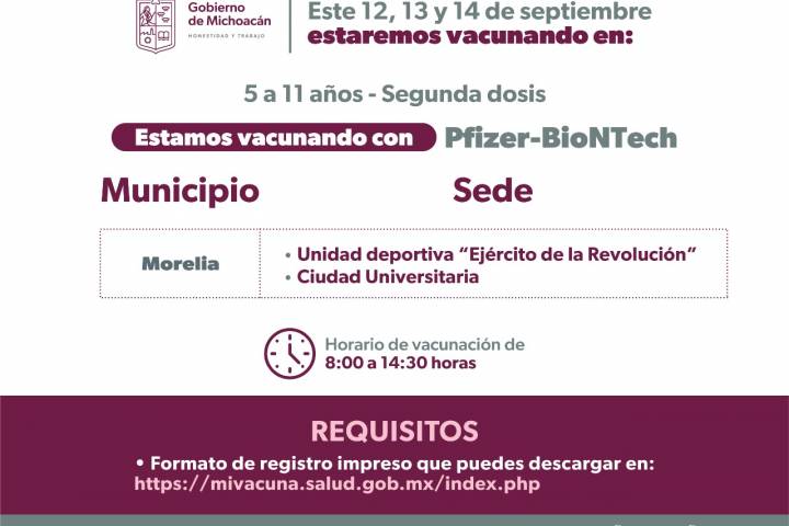 NOTICIAS 12/09/2022Arranca aplicación de segundas dosis de 5 a 11 en Morelia y UruapanEste 12 de septiembre arranca, en Morelia y Uruapan, la aplicación de la segunda dosis anti Covid-19, para niños de 5 a 11 años; los menores serán inmunizados con el biológico de Pfizer-BioNTech.