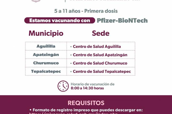 Se trata de Aguililla, Apatzingán, Churumuco, Tepalcatepec y Caltzontzín los municipios que hoy vacunan primeras dosis de Pfizer-BioNTEch a niños de 5 a 11 años de edad y de Uruapan y Angamacutiro los que aplican primeras y segundas dosis a los adolescentes d... Ver más...