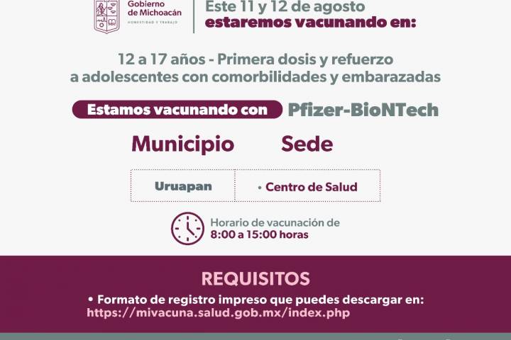NOTICIAS 12/08/2022Hoy viernes continúa vacunación contra Covid-19 en UruapanLa aplicación de primeras y segundas dosis para adolescentes de 12 a 17 años, con alguna comorbilidad, continúa en Uruapan, y este viernes 12 de agosto se estará vacunando contra el Covid-19 en las instalaciones del centro de salud.