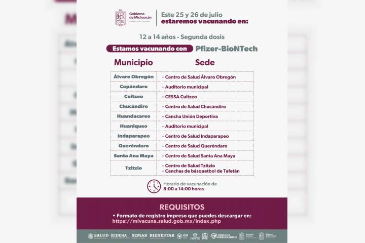 NOTICIAS 25/07/2022Continúa vacunación de segundas dosis para jóvenes de 12 a 14 añosEste lunes 25 de julio, continúa la vacunación de segundas dosis a los jóvenes de 12 a 14 años de edad en el interior de Michoacán, en módulos instalados en los municipios de Álvaro Obregón, Copándaro, Cuitzeo, Chucándiro, Huandacareo y Huaniquo.