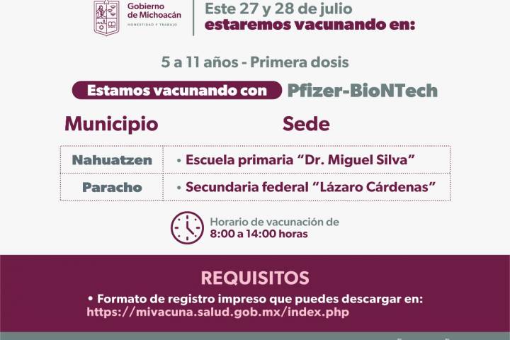 NOTICIAS 26/07/2022Continúa vacunación anti Covid-19 a niños de 5 a 11 años Del 26 al 29 de julio continúa la vacunación contra el Covid-19 a los niños de 5 a 11 años de edad de los municipios de Charo, Cuitzeo, Zinapécuaro, Tancítaro, Nahuatzen y Paracho.
