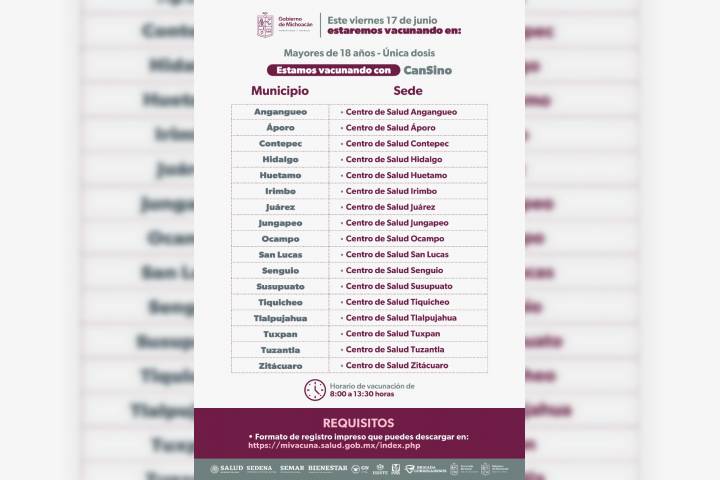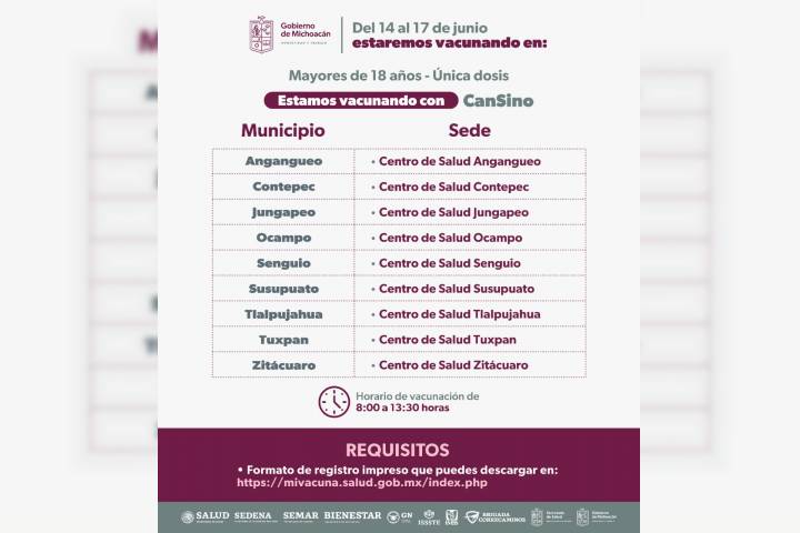 La jornada se realizará en los municipios de Angangueo, Contepec, Jungapeo, Senguio, Ocampo, Susupuato, Tlalpujahua, Tuxpan y Zitácuaro, cuyas sedes serán en sus respectivos centros de salud, con horario de 8:00 a 13:30... Ver más...