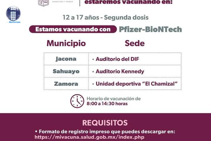 NOTICIAS 02/06/2022Este 2 y 3 de junio, SSM aplica segundas dosis anti COVID-19 a menores de 12 a 17 años en 13 municipiosEste 2 y 3 de junio, la SecretarÃa de Salud de Michoacán (SSM) aplicará segundas dosis de la vacuna anti COVID-19 a menores de entre 12 a 17 años en 13 municipios de la entidad.