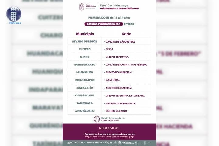 Este sábado 14 de mayo, el Gobierno de Michoacán continúa con la vacunación contra el Covid-19, para los adolescentes de 12 a 14 años en 10 municipios del estado, por lo que la Secretaría de Salud de Michoacán (SSM) los exhorta a inmunizarse. Se trata de los municipios de Álvaro Obregón, Cuitzeo, Charo, Huandacareo, Huaniqueo, Indaparapeo, Maravatío, Queréndaro, Tarímbaro y Zinapécuaro, los que estarán aplicando primeras dosis d...
