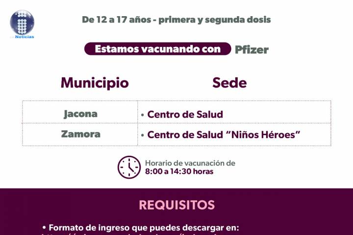 Este próximo lunes 9 de mayo, el Gobierno de Michoacán continuará con la vacunación contra el Covid-19, para todos los adolescentes de 12 a 17 años del interior del estado, que requieran de la primera o segundad dosis del biológico Pfizer. Los módulos de vacunación estarán instalados en los municipios de Jacona, Zamora, Tancítaro, Aguililla, Buenavista, Apatzingán, Coalcomán, Churumuco, La Huacana, Múgica, Parácuaro, Tepalcatepec...