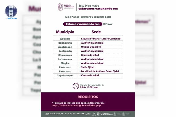 Continúa la inmunización anti COVID-19, para menores de 12 a 17 años, pertenecientes a 16 municipios del interior del estado con el biológico Pfizer. Por ello, este 9 y 10 de mayo se estará aplicando sólo primera dosis a jóvenes de Aquila, Coahuayana, Arteaga, Tumbiscatío y sólo este lunes a los de Tancítaro. Asimismo, el día de hoy en Aguililla, Buenavista, Apatzingán, Coalcomán, Churumuco, La Huacana, Múgica, Parácuaro, Tep...