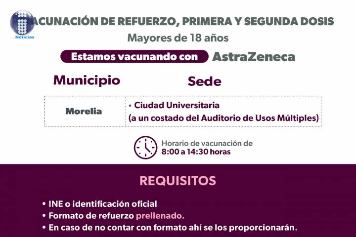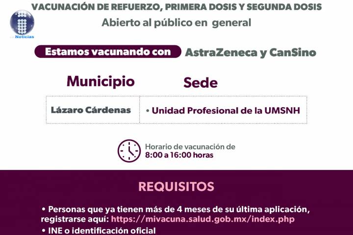 NOTICIAS 27/04/2022Habilitan módulos de vacunación anti Covid-19 en universidades de Lázaro Cárdenas Del miércoles 27 al sábado 30 de abril, la Unidad Profesional de la Universidad Michoacana de San Nicolás de Hidalgo (UMSNH) y el Instituto Tecnológico, ambos de Lázaro Cárdenas mantendrán en operación dos módulos de vacunación anti COVID-19 para la población mayor de 18 años que necesite su primera y segunda dosis, así como el refuerzo.