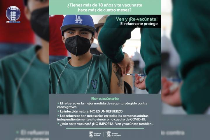 NOTICIAS 06/04/2022Invita la SSM a rezagados mayores de 18 años a aplicarse el refuerzo anti Covid-19A todas las personas mayores de 18 años y que se hayan vacunado hace más de cuatro meses, la Secretaría de Salud de Michoacán (SSM), los invita a aplicarse el refuerzo de vacuna anti Covid-19, y estar al tanto de las publicaciones sobre las fechas y los lugares en los que se llevará a cabo la inmunización.