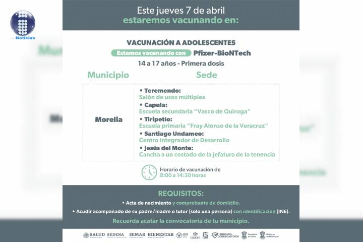 Este jueves 7 de abril, la Secretaría de Salud de Michoacán (SSM) aplicará primeras dosis de la vacuna anti COVID-19 a menores de 14 a 17 años, en cuatro tenencias de Morelia.