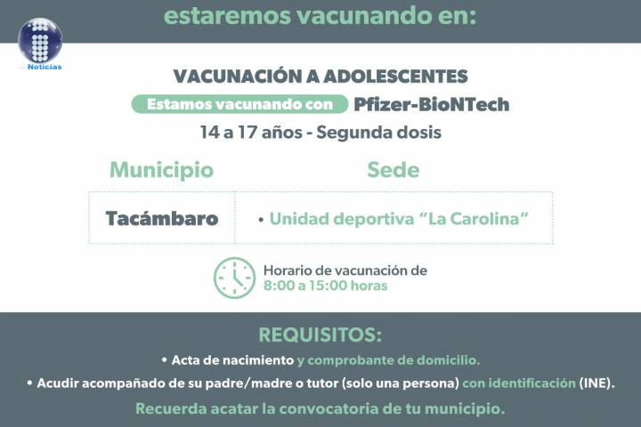 NOTICIAS 18/03/2022Arranca aplicación segunda dosis anti COVID-19, en Tacámbaro a jóvenes de 12 a 17 Arranca la aplicación de segunda dosis de vacuna anti COVID-19, para adolescentes de 14 a 17 años y a comórbidos de 12 a 17 años del municipio de Tacámbaro.