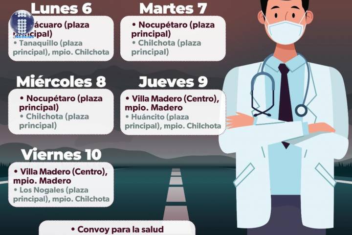 La Secretaría de Salud de Michoacán (SSM), informa a la población sobre los lugares en los que se encontrarán los Convoyes de Salud y de Pueblos Indígenas, con los que se otorgan servicios gratuitos, del 6 al 10 de diciembre. La unidad móvil de Pueblos Indígenas estará el lunes 6 de diciembre en la plaza principal de Tanaquillo, municipio de Chilchota y en la plaza principal de Carácuaro, mientras que el martes 7 y miércoles 8 de dic...