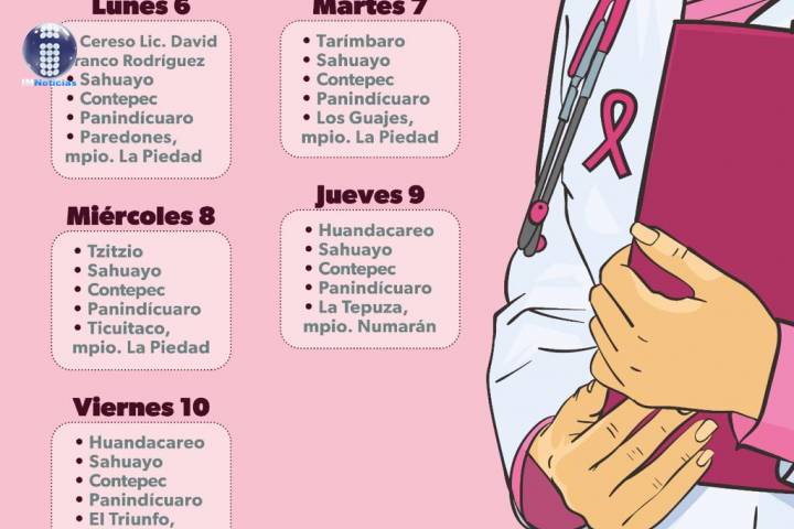 La Secretaría de Salud de Michoacán (SSM), continúa con las acciones de diagnósticos oportunos de cáncer de mama a través de los mastógrafos móviles, que estarán en varios municipios de la entidad, del 6 al 10 de diciembre. Los convoyes de mastografía brindarán servicio gratuito a mujeres de 40 a 69 años de edad, en el Cereso "Lic. David Franco Rodríguez", Sahuayo, Contepec, Panindícuaro, La Piedad, Tarímbaro, Tzitzio, Huandac...